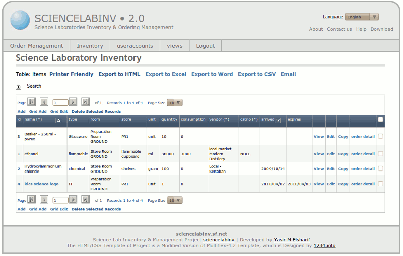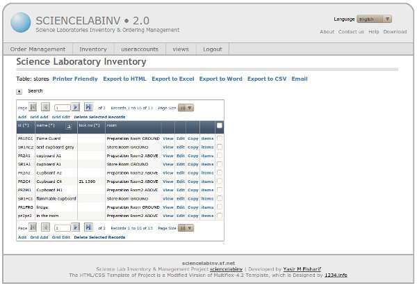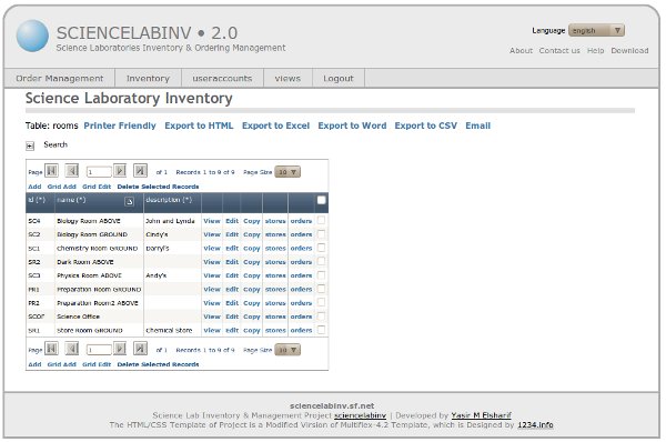 The inventory system assumes that you have a science department, which is divided into rooms (office, laboratories, and store rooms), each of these rooms has stores (cuporads, fridge, shelfs ... etc) where the items (chemical and equipment) are stored, these items are classified by types