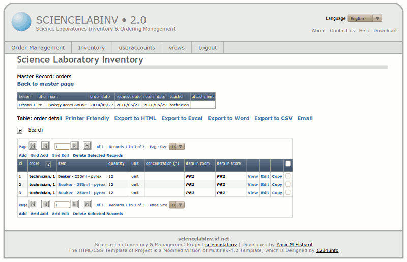 - Dumb MySQL schema from file sciencelabinv.sql to your created mysql database